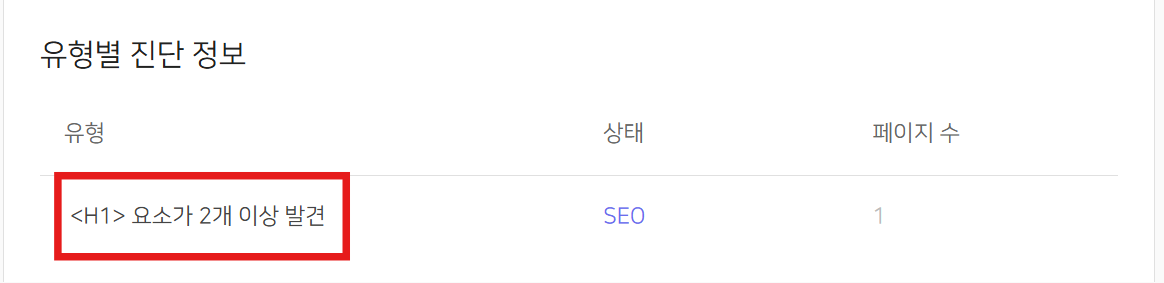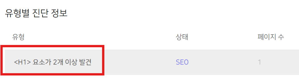 - 리포트 - 사이트진단 - 유형별 진단 정보 - <H1>요소가 2개 이상 발견을 누릅니다.