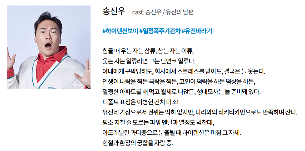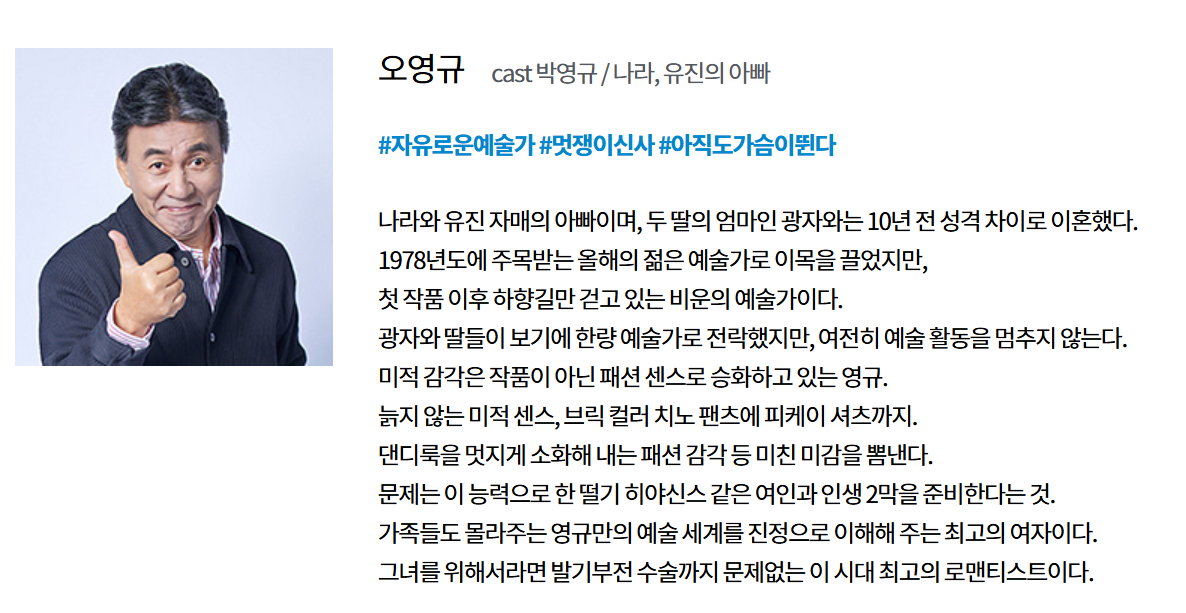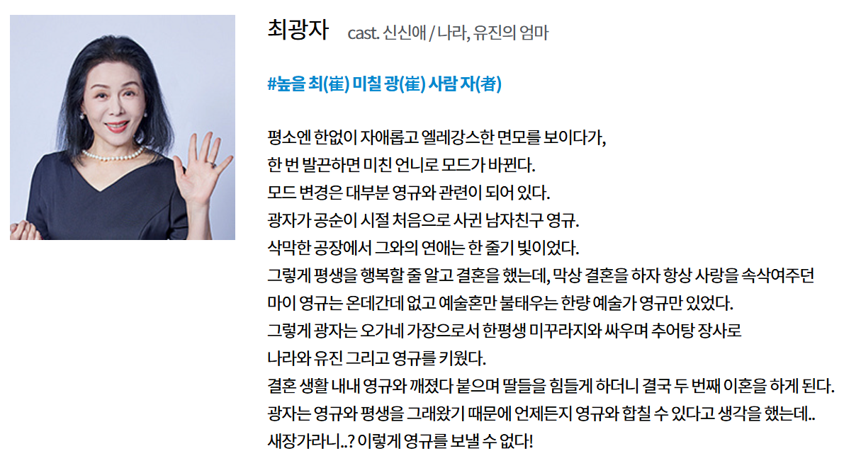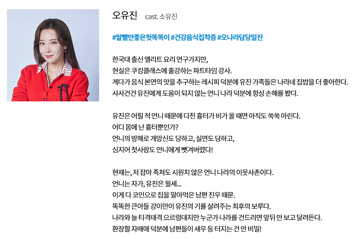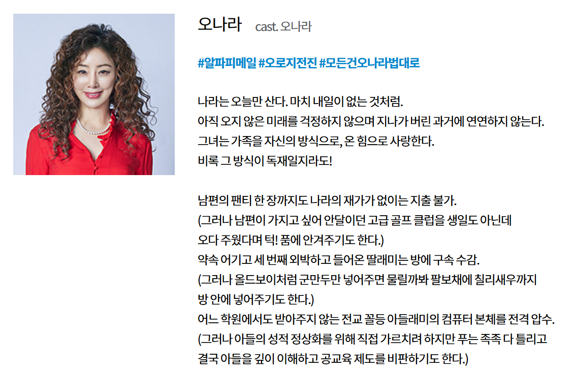 시트콤 캐릭터의 대명사였던 야동순재와 고집불통 신구의 시대는 끝났다. 이 드라마는 다소 무모하지만 사랑스러운 사고뭉치 ‘오나라’와 그녀의 동생 ’오유진’이 전통적 가부장제를 깨부수는, 하지만 꼼꼼히 숨겨놓은 책임감을 꺼내어 격한 감동을 주는 이야기다. 이제 인정해야 한다. 바야흐로 현대 가족의, 한국 가족의 구심점이자 춤추는 주부(아줌마, 엄마)의 등장이다. K-줌마 관찰기에 나오는 자매들을 보며 웃고, 조롱하고, 숭배하고, 감동하는 유쾌한 스토리!