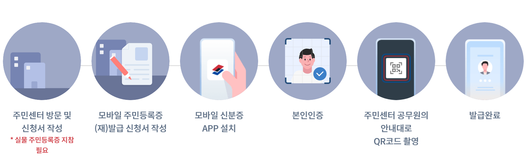 주민센터에서 IC 주민등록증 신청 후 주민센터 방문 또는 등기로 수령 - 모바일 신분증 앱 다운로드 - 발급받은 IC 주민등록증을 휴대폰 뒷면에 태그하여 본인인증 - 발급완료