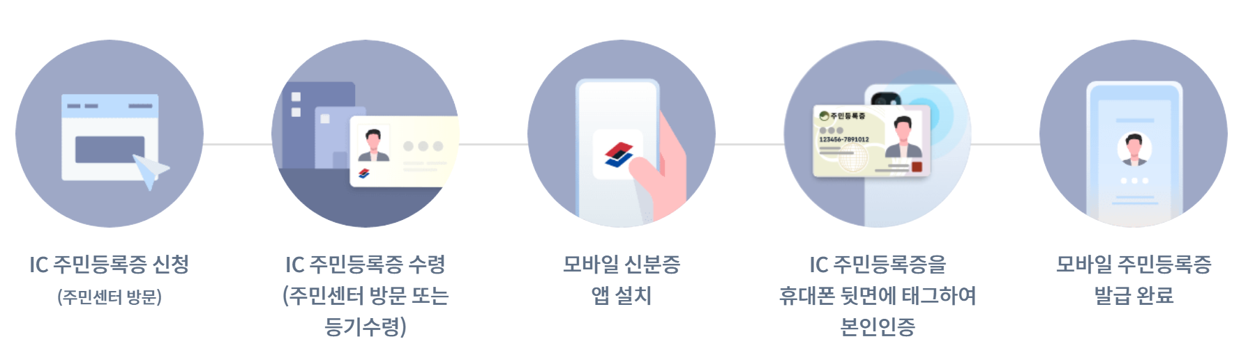 주민센터에서 IC 주민등록증 신청 후 주민센터 방문 또는 등기로 수령 - 모바일 신분증 앱 다운로드 - 발급받은 IC 주민등록증을 휴대폰 뒷면에 태그하여 본인인증 - 발급완료