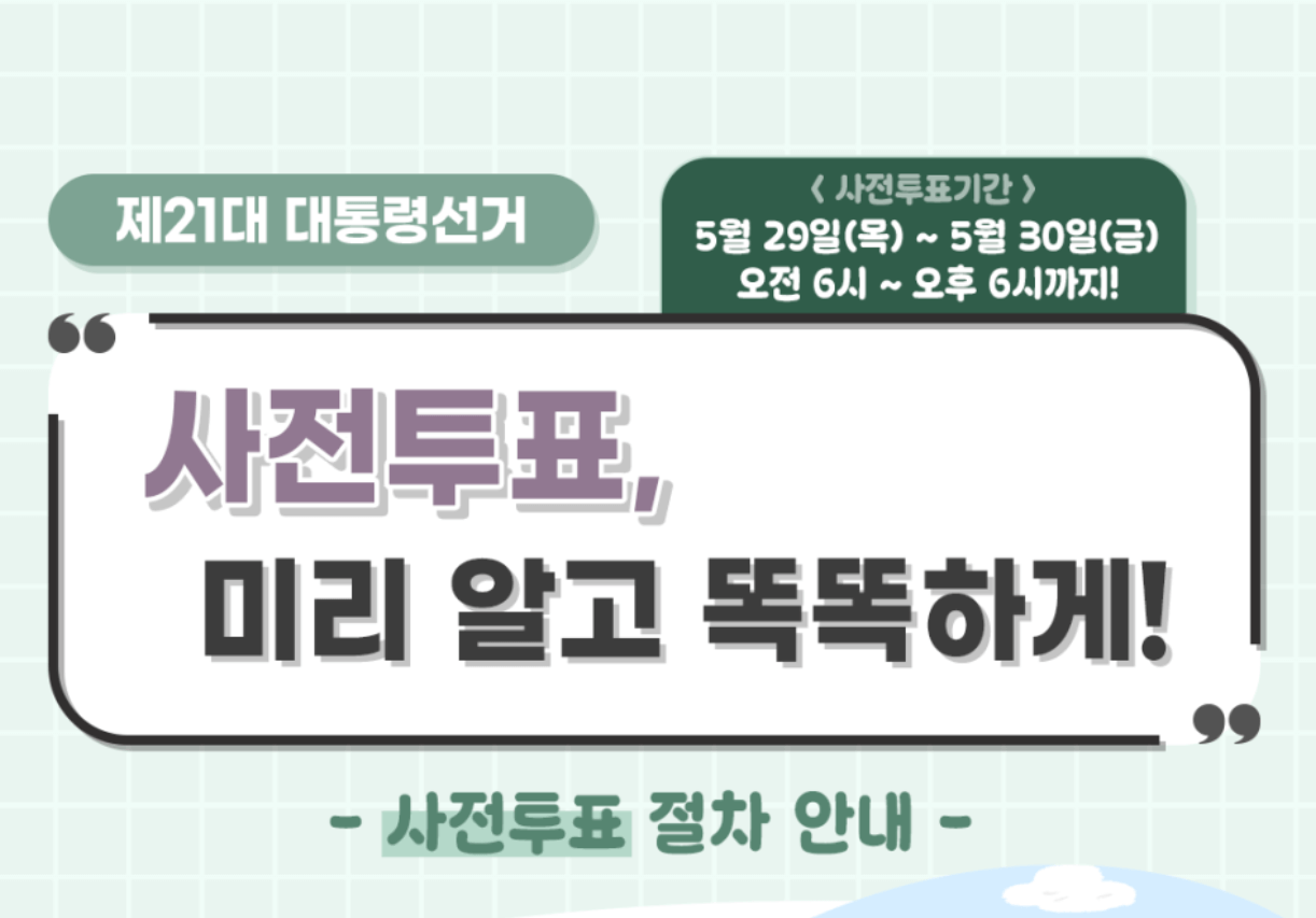 2025년 사전투표 일정일은 2025년 5월 29일(목) ~ 5월 30일(금) 이며 투표시간은 오전 6시 ~ 오후 6시까지입니다.