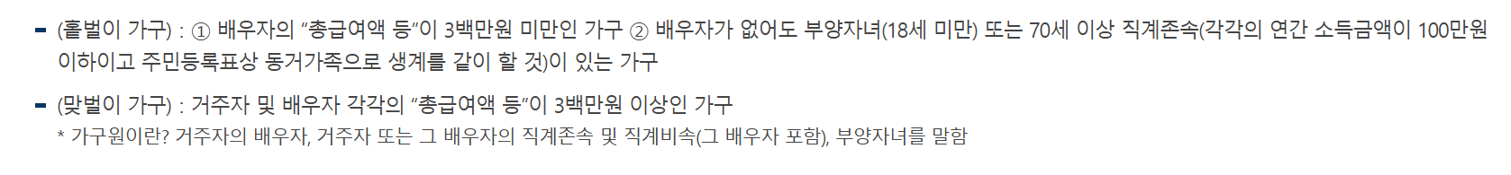 | 가구원 요건 | - 배우자의 “총급여액 등”이 3백만원 미만인 가구 - 배우자가 없어도 부양자녀(18세 미만) 또는 70세 이상 직계존속이 있는 가구 |