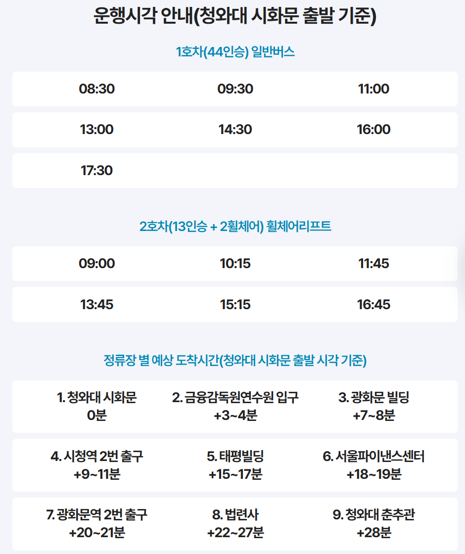 관람객의 편의를 위해 시청을 기준으로 인근 주변 정류장에서청와대까지 무료로 셔틀버스를 운행합니다.
