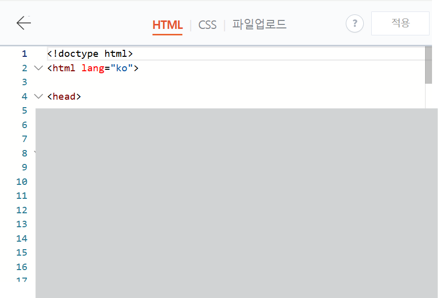 1-6. <head> 아래에 복사한 메타태그 코드를 붙여넣기 하고 적용을 누릅니다.
