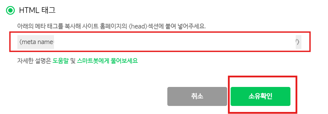 1-4. 사이트 소유확인 화면에서 HTML 태그를 선택하고 메타태그를 복사하세요.