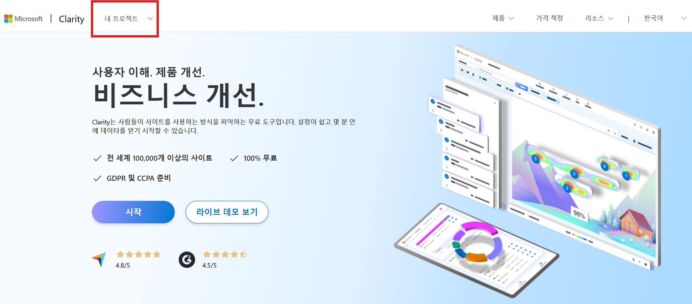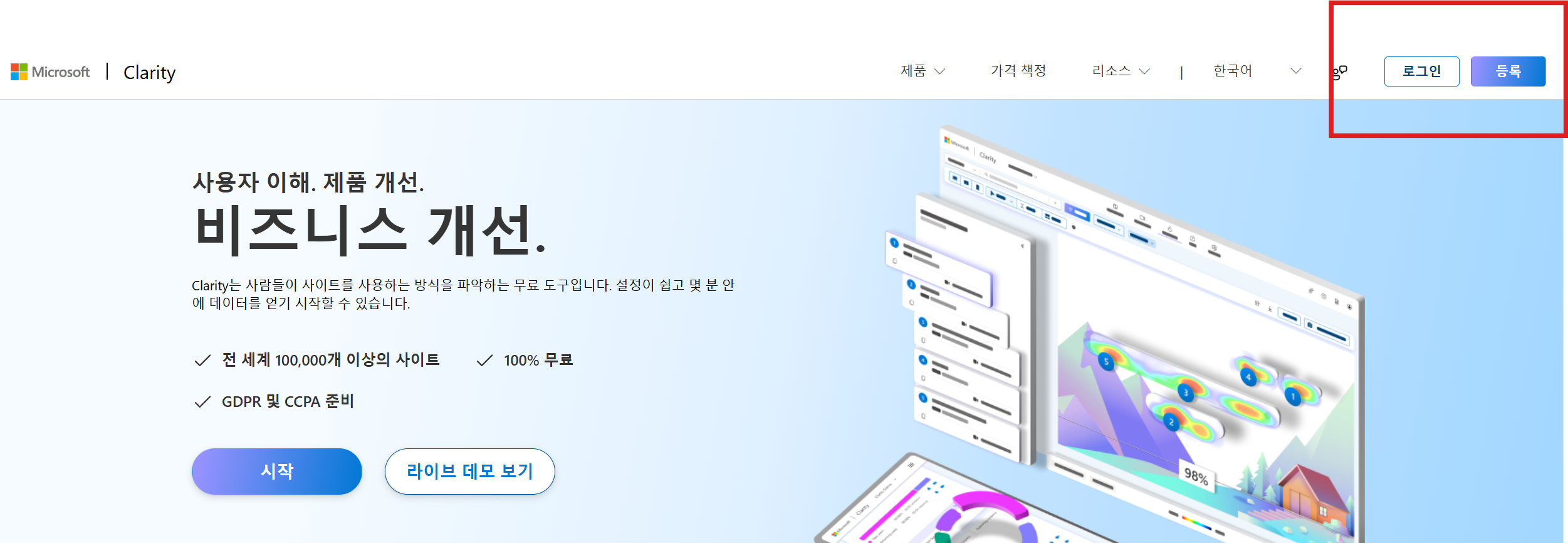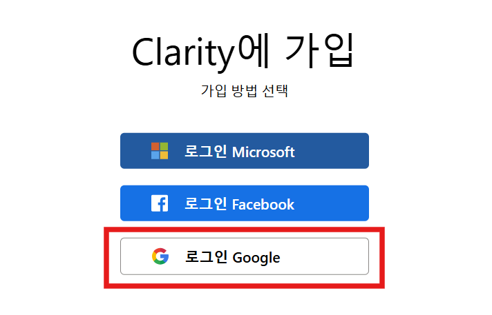 1. 클래리티(https://clarity.microsoft.com/)에 접속, 로그인 또는 등록 선택합니다.