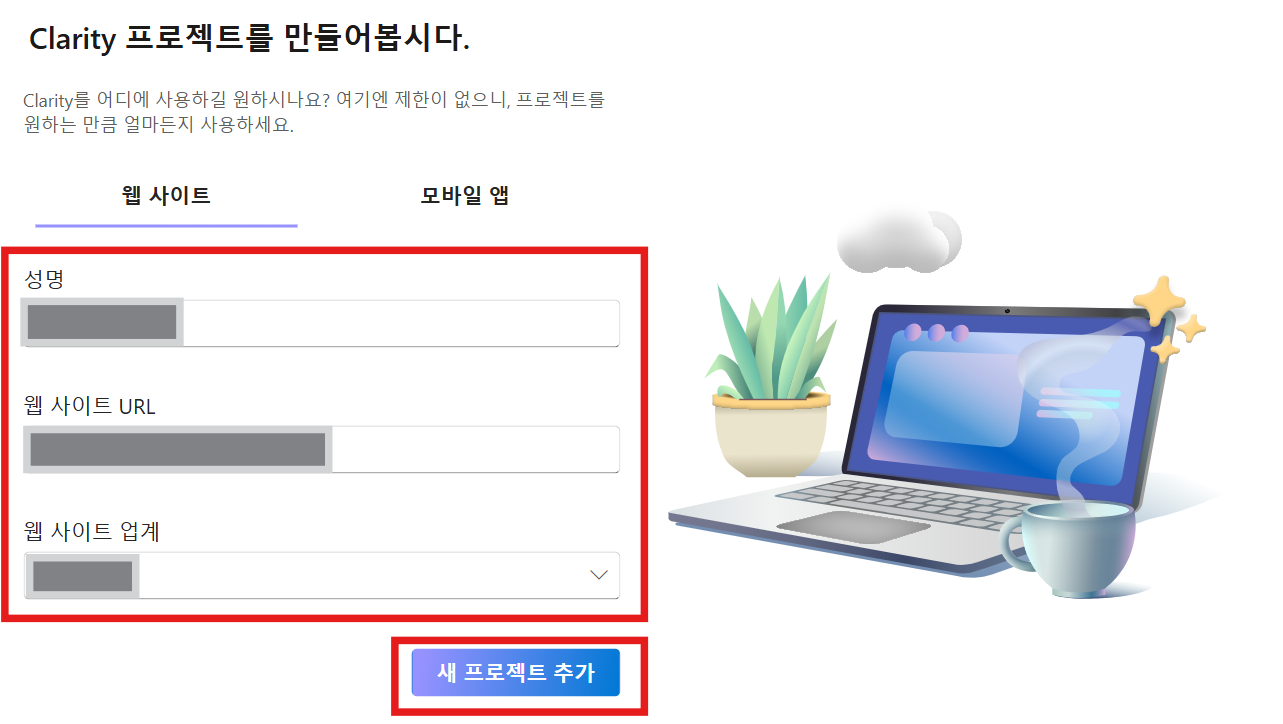 3. 웹사이트에서 성명, 웹사이트 URL, 웹사이트 업계를 선택한 후 새 프로젝트 추가를 클릭합니다.
